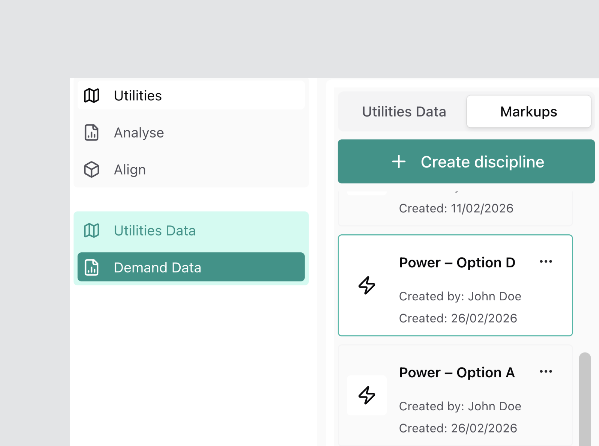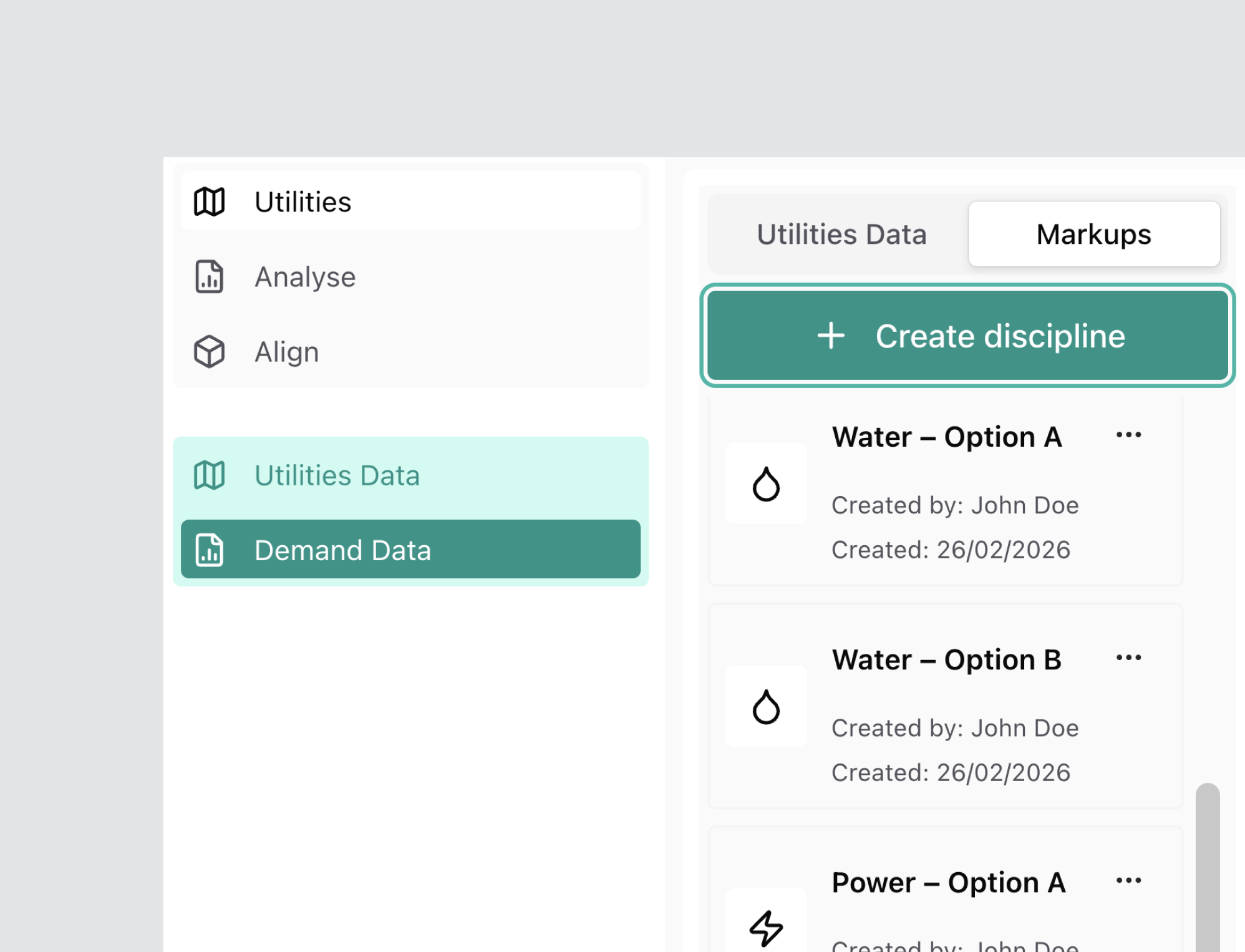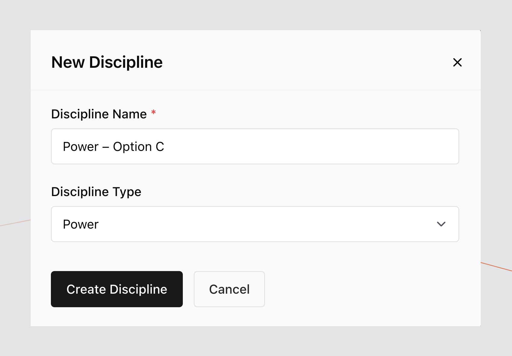 A Discipline represents a specific infrastructure category (e.g. Power, Water, Sewer) within a Design Option.