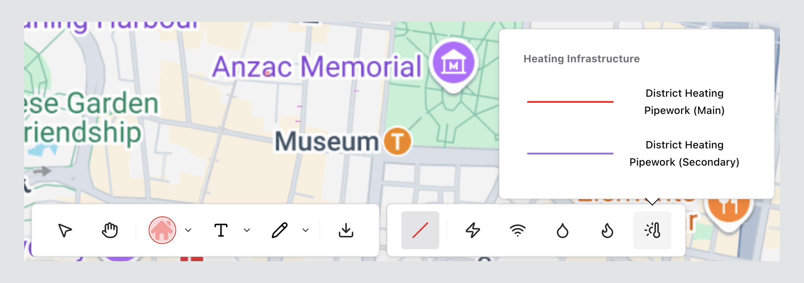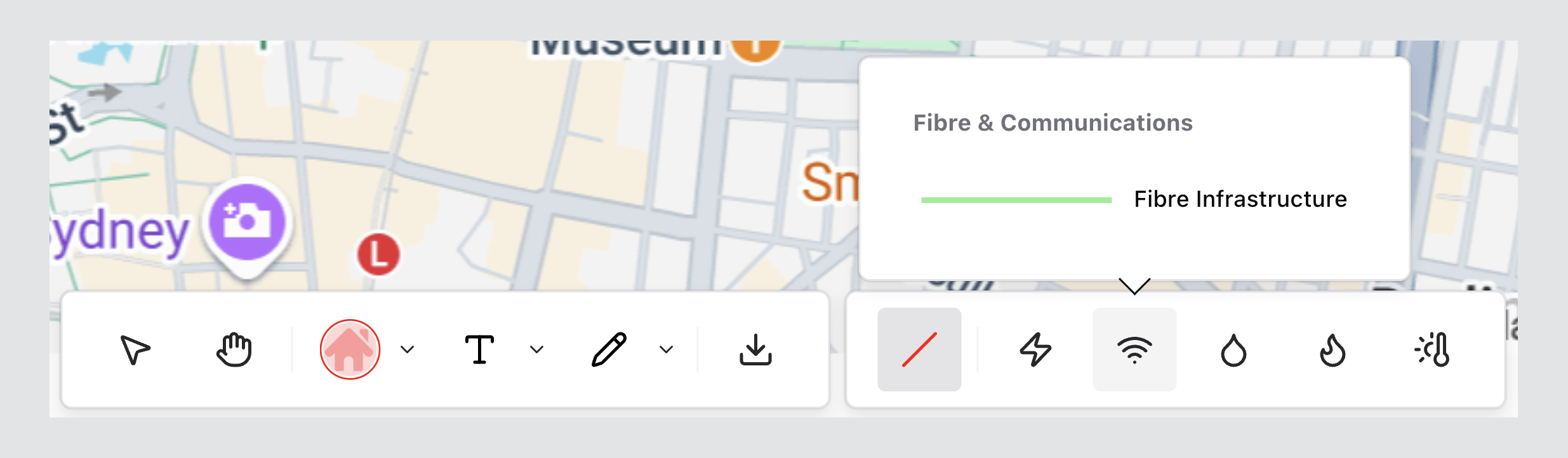 The Discipline Tool lets you switch between disciplines (e.g. Electrical, Fibre, Gas) and apply discipline-specific infrastructure styles.